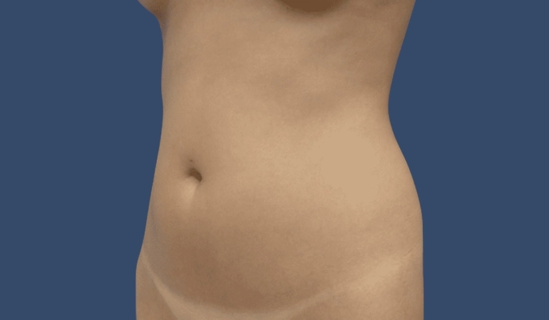 Nesta imagem (número 1) ao lado esquerdo a pele apresenta boas qualidades que não se enquadram na indicação para abdominoplastia, a pele tem aparência lisa, sem dobras, a cicatriz umbilical está bem aberta, de formato redondo.