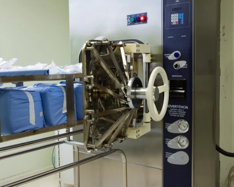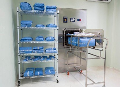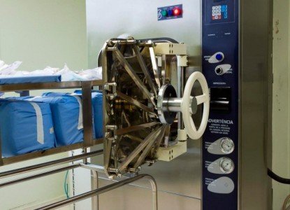 A central de Esterilização possui auto-clave de Barreira totalmente automatizada, onde o material passa por ciclo específico de esterilização, pré programado e sai do aparelho por porta independente, permanecendo armazenado dentro de sala exclusiva para materiais esterilizados.